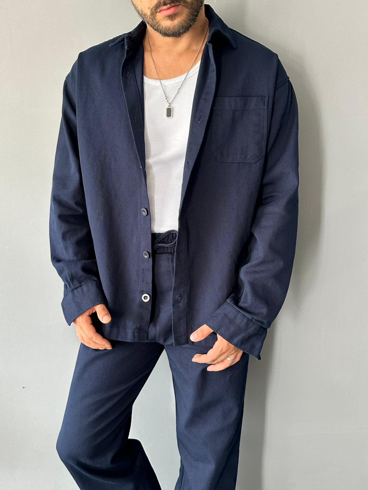 Alt üst 2 parça takım halindedir, Üst, gömlek yakalı kapaması düğmeli, sırtı pileli, 1 adet cep detaylı kalın ve gramajlı gömlek ceket modeldir.