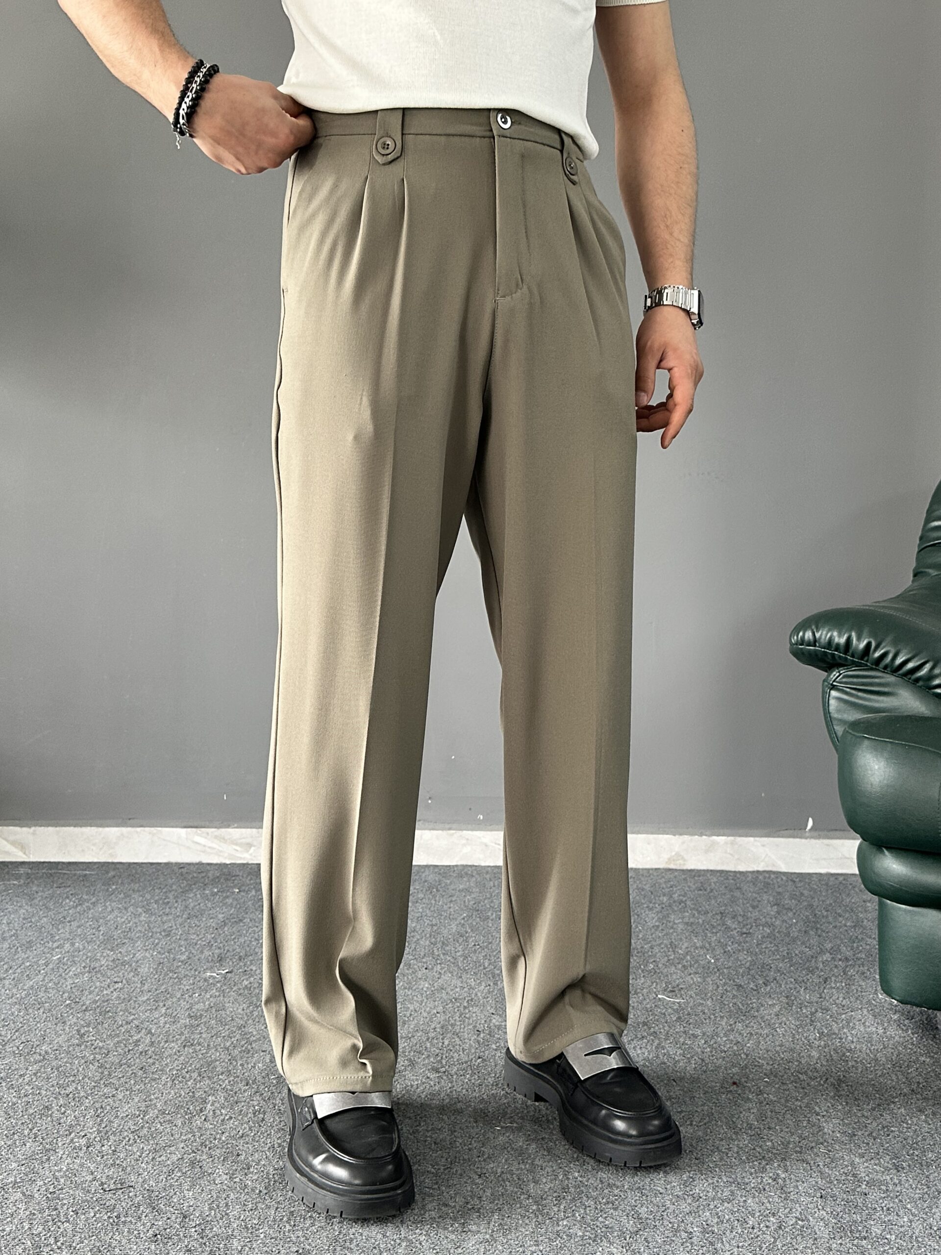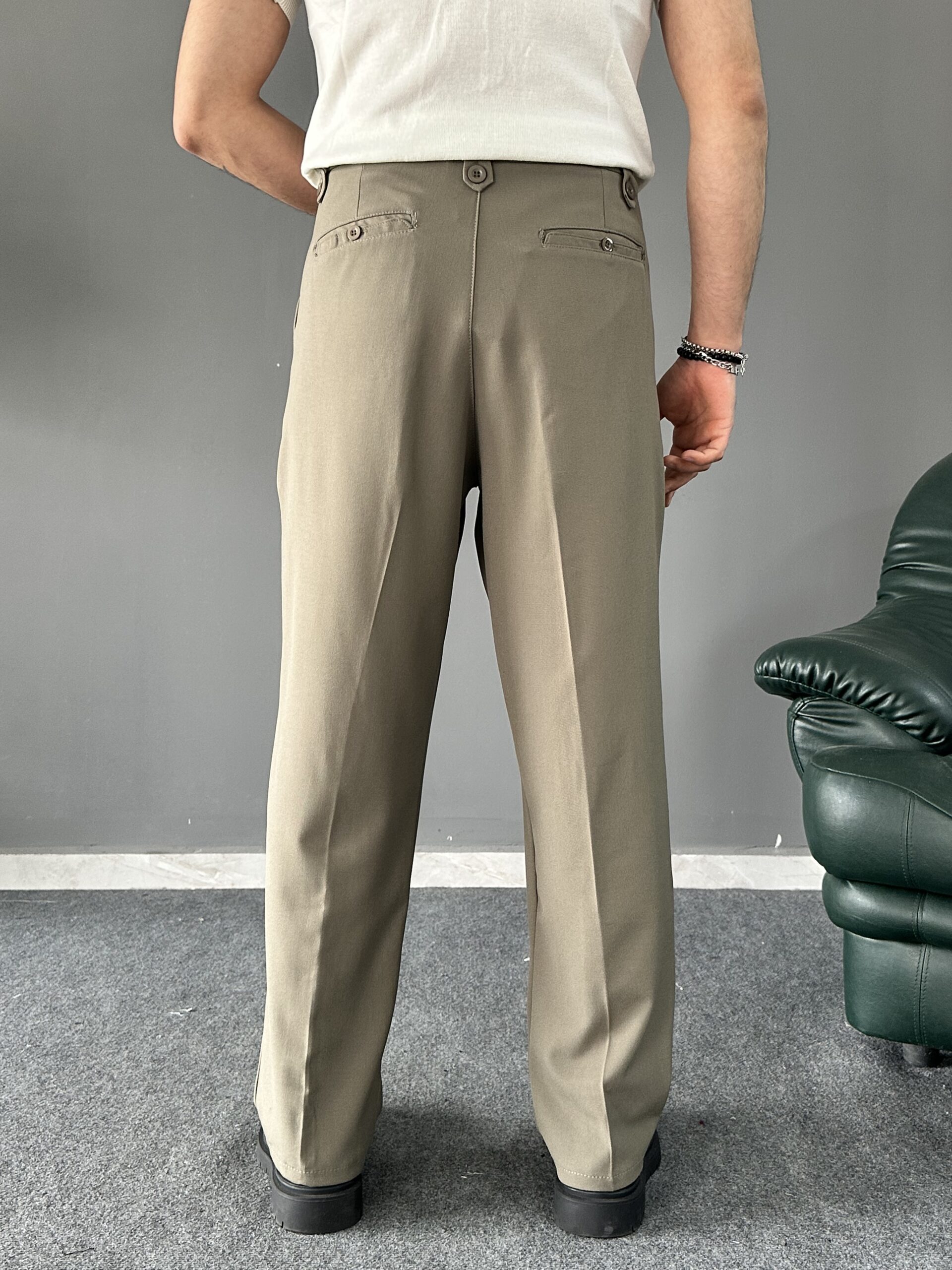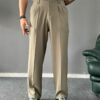 Ürün Yüksek bel, çift pile detaylı, kapaması düğme ve fermuarlı kemer dil detaylı , 2 adet yan 2 adet düğmeli arka cep detaylı, boru paçalı ve baggy kalıplı pantolon modelidir.