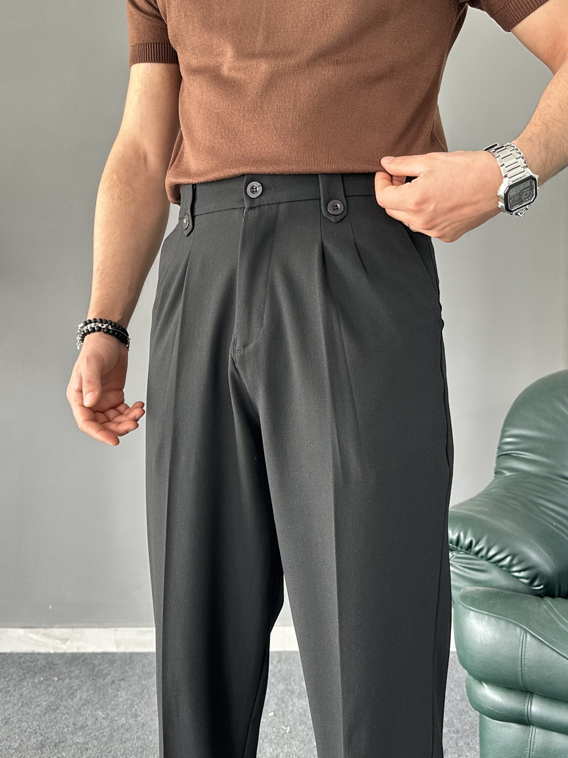 Ürün Yüksek bel, çift pile detaylı, kapaması düğme ve fermuarlı kemer dil detaylı , 2 adet yan 2 adet düğmeli arka cep detaylı, boru paçalı ve baggy kalıplı pantolon modelidir.