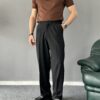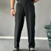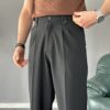 Ürün Yüksek bel, çift pile detaylı, kapaması düğme ve fermuarlı kemer dil detaylı , 2 adet yan 2 adet düğmeli arka cep detaylı, boru paçalı ve baggy kalıplı pantolon modelidir.
