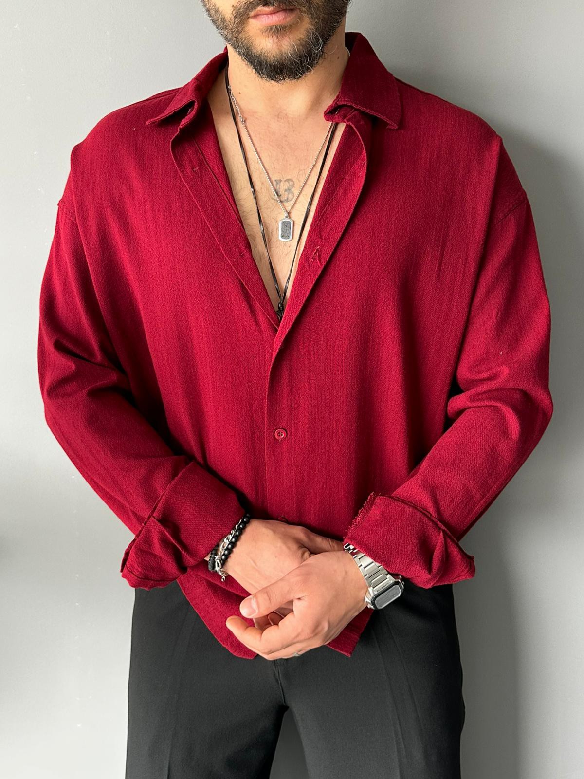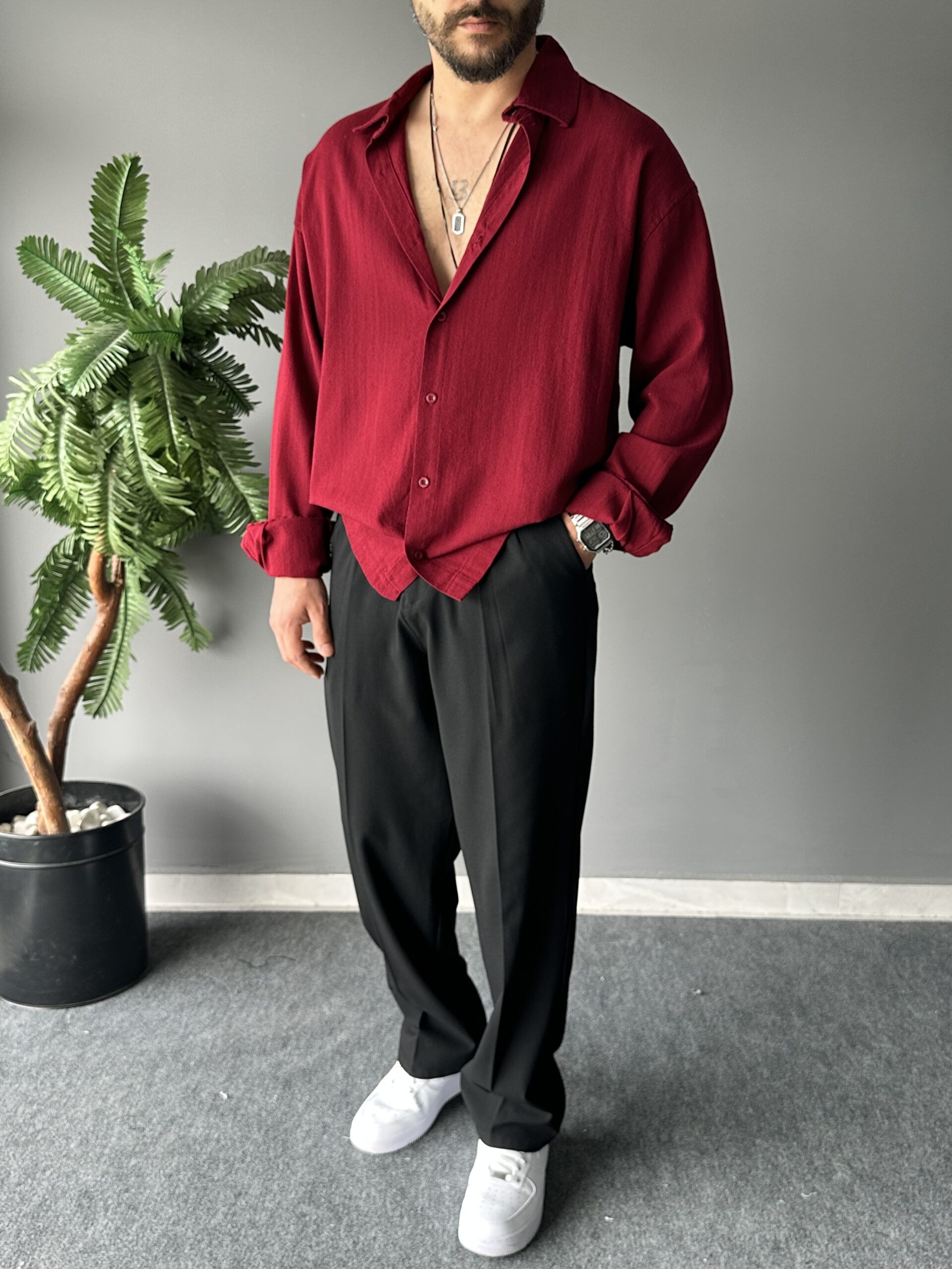Fresh Keten Kumaş Süper Oversize Bordo Gömlek