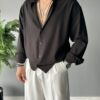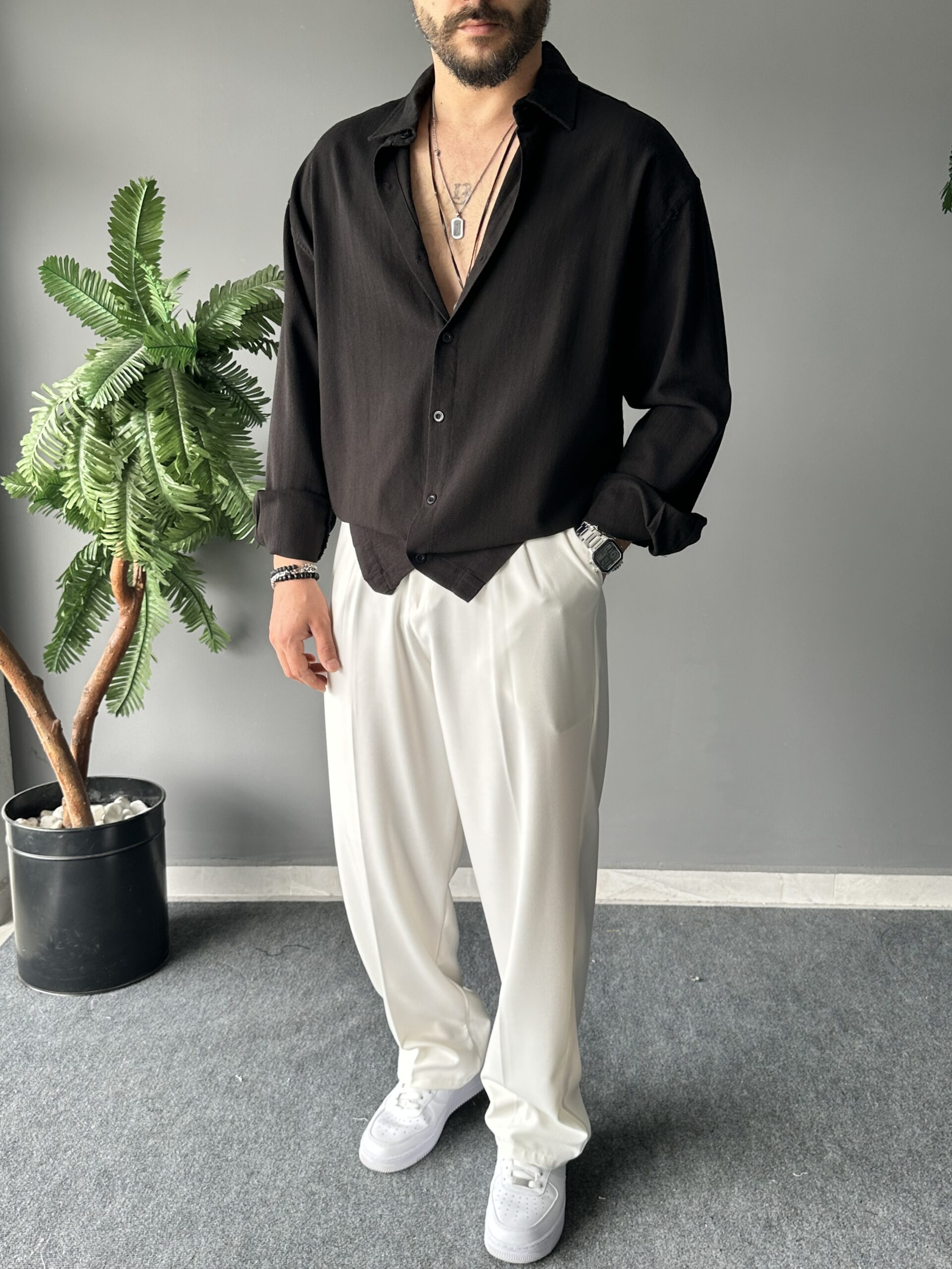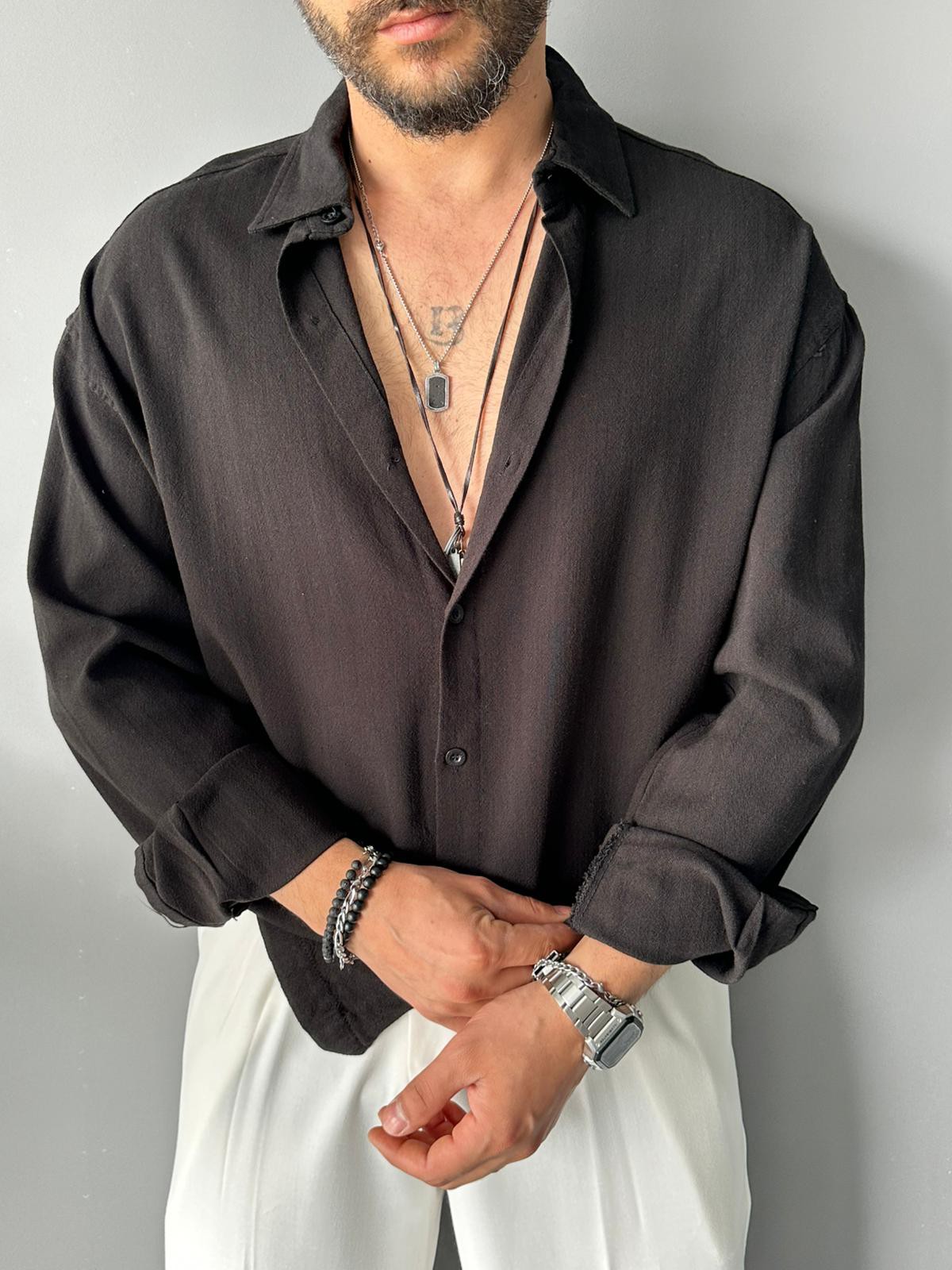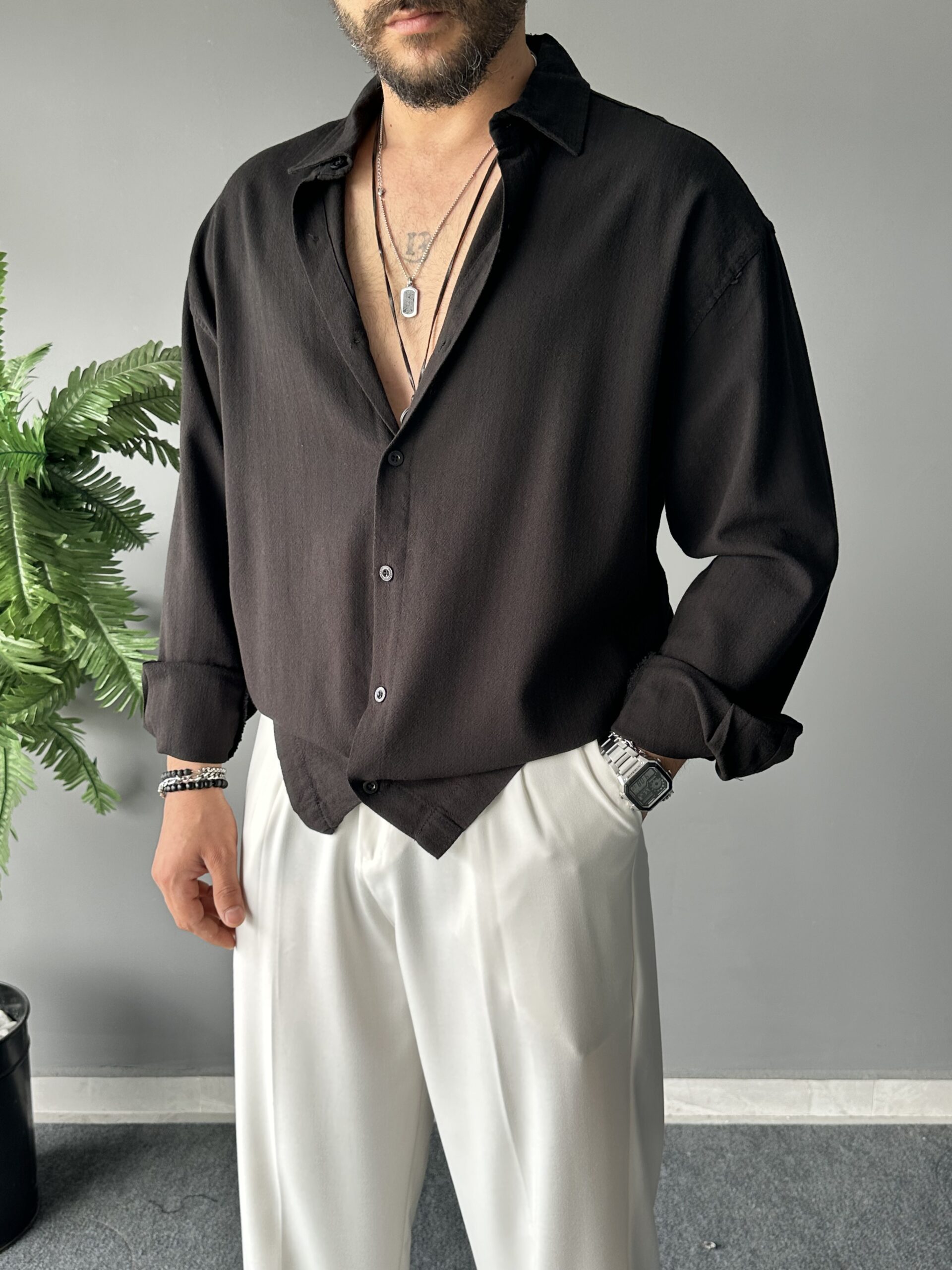 Fresh Keten Kumaş Süper Oversize Siyah Gömlek