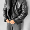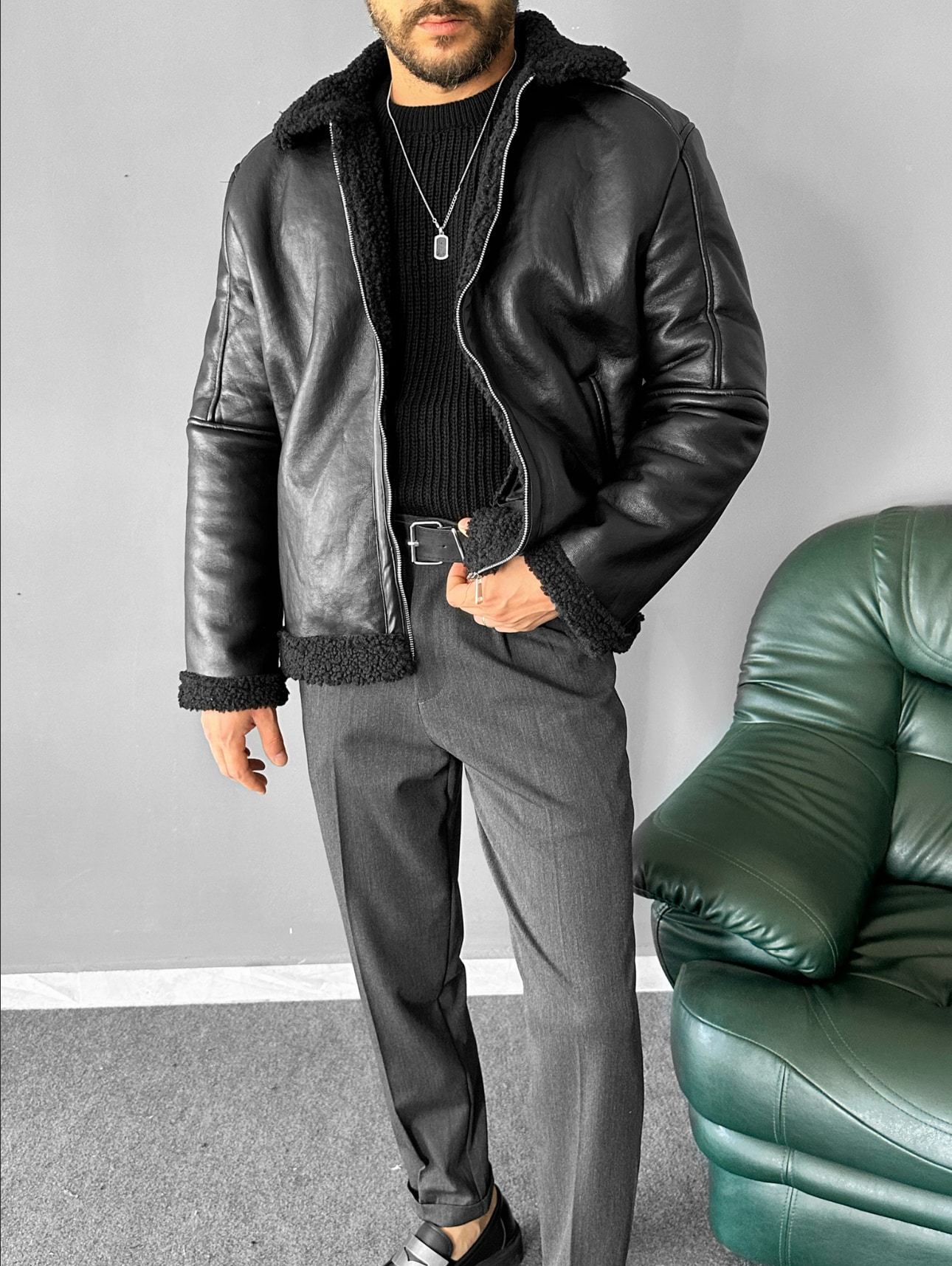 İçi Kürklü Dik Yakalı Siyah Deri Ceket