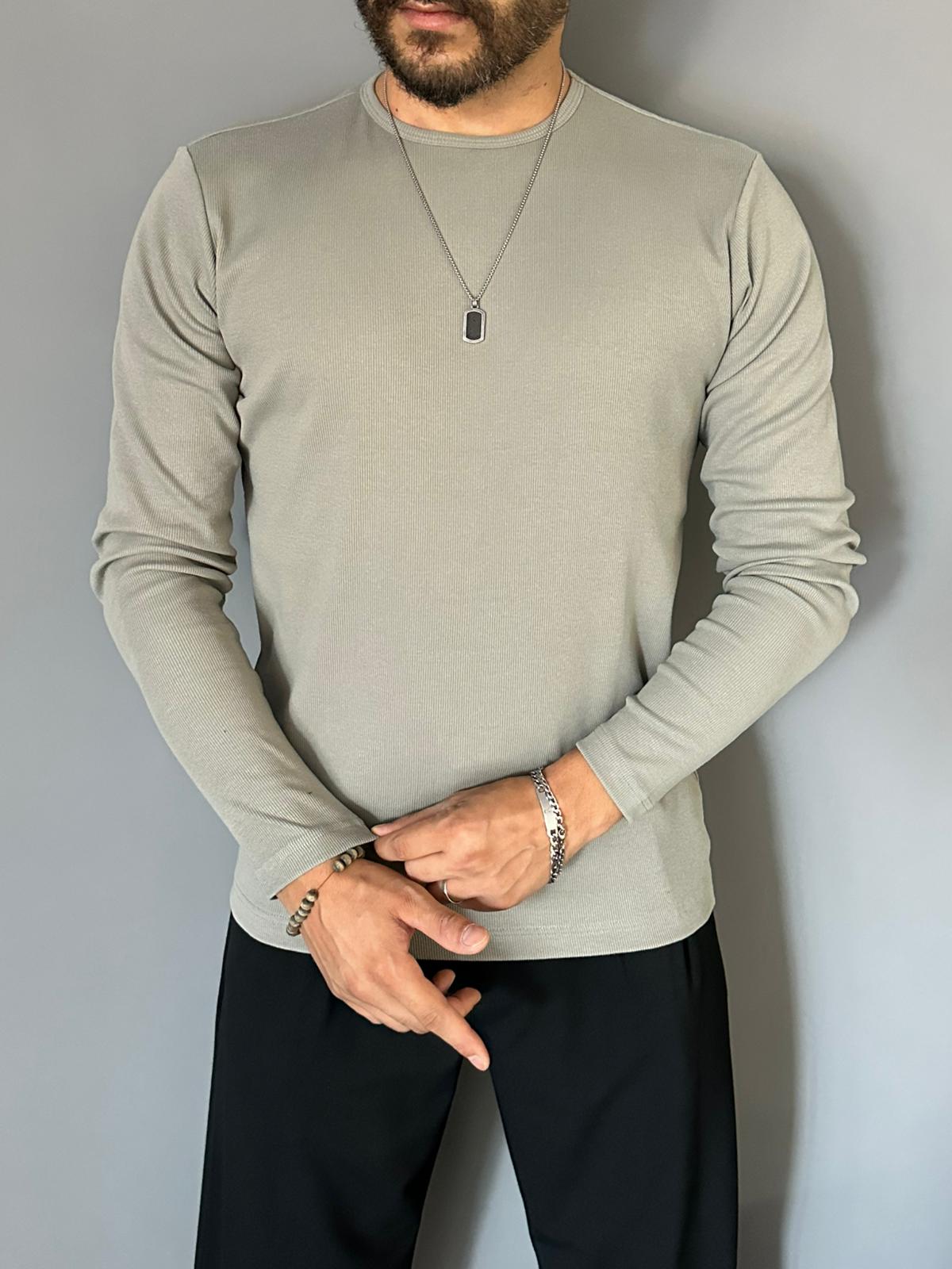 Bisiklet yakalı, etek düz kesim, likralı esnek yapılı kumaş, ince fitilli (çizgili) desenli, slim fit kesime sahip sweat modeldir.