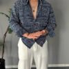 Keten Kabartma Baskılı Lacivert Regular Gömlek
