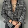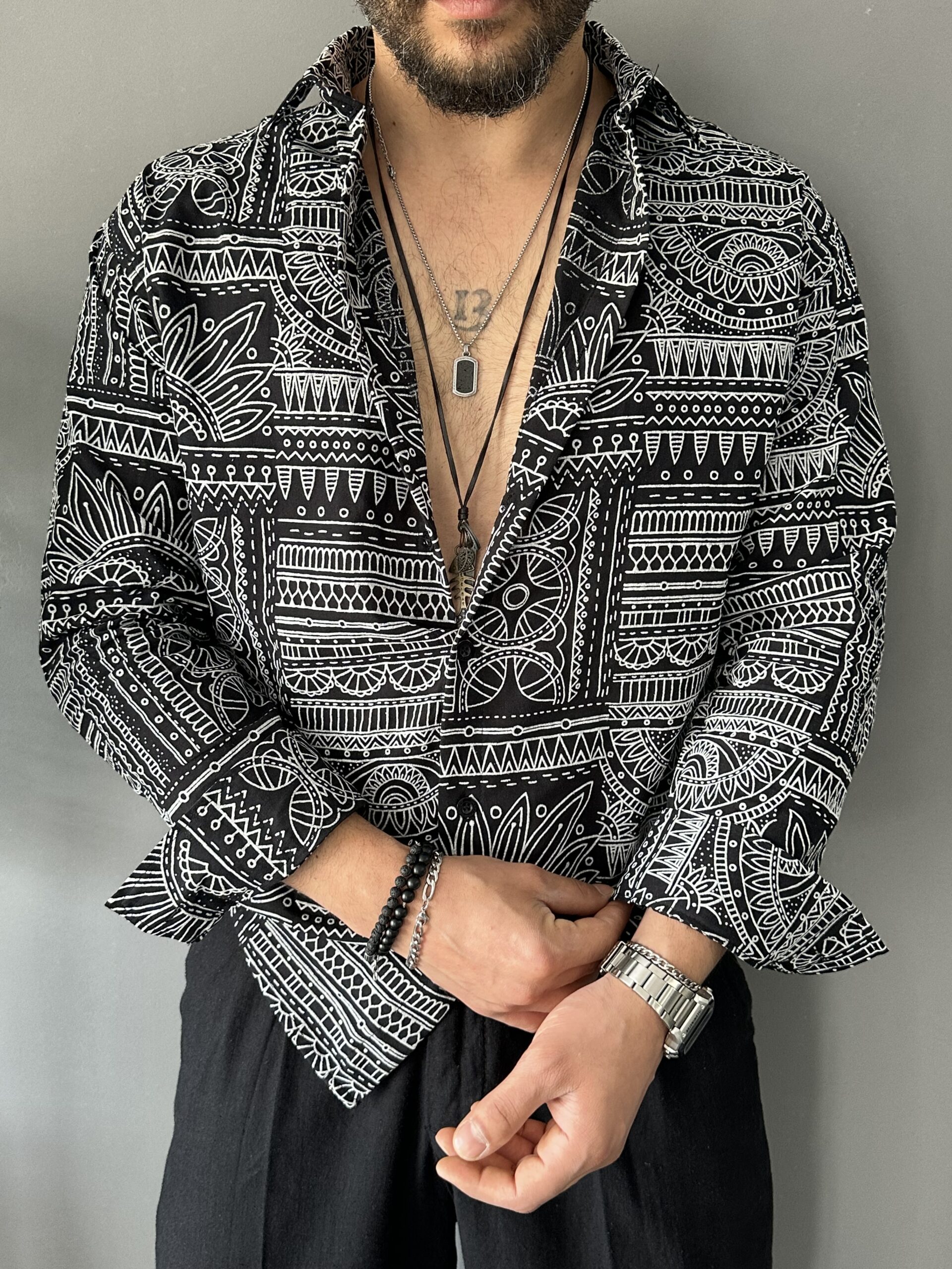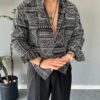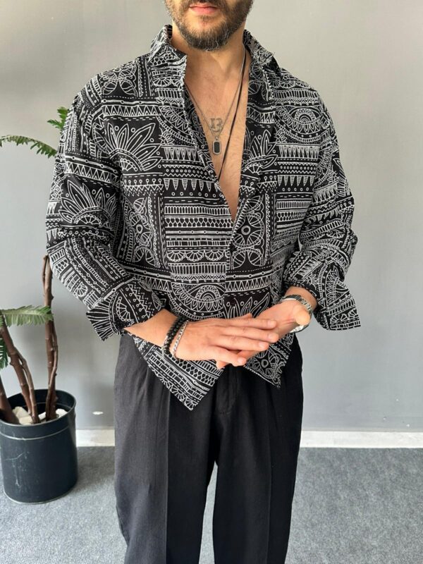 Keten Kabartma Baskılı Siyah Regular Gömlek