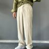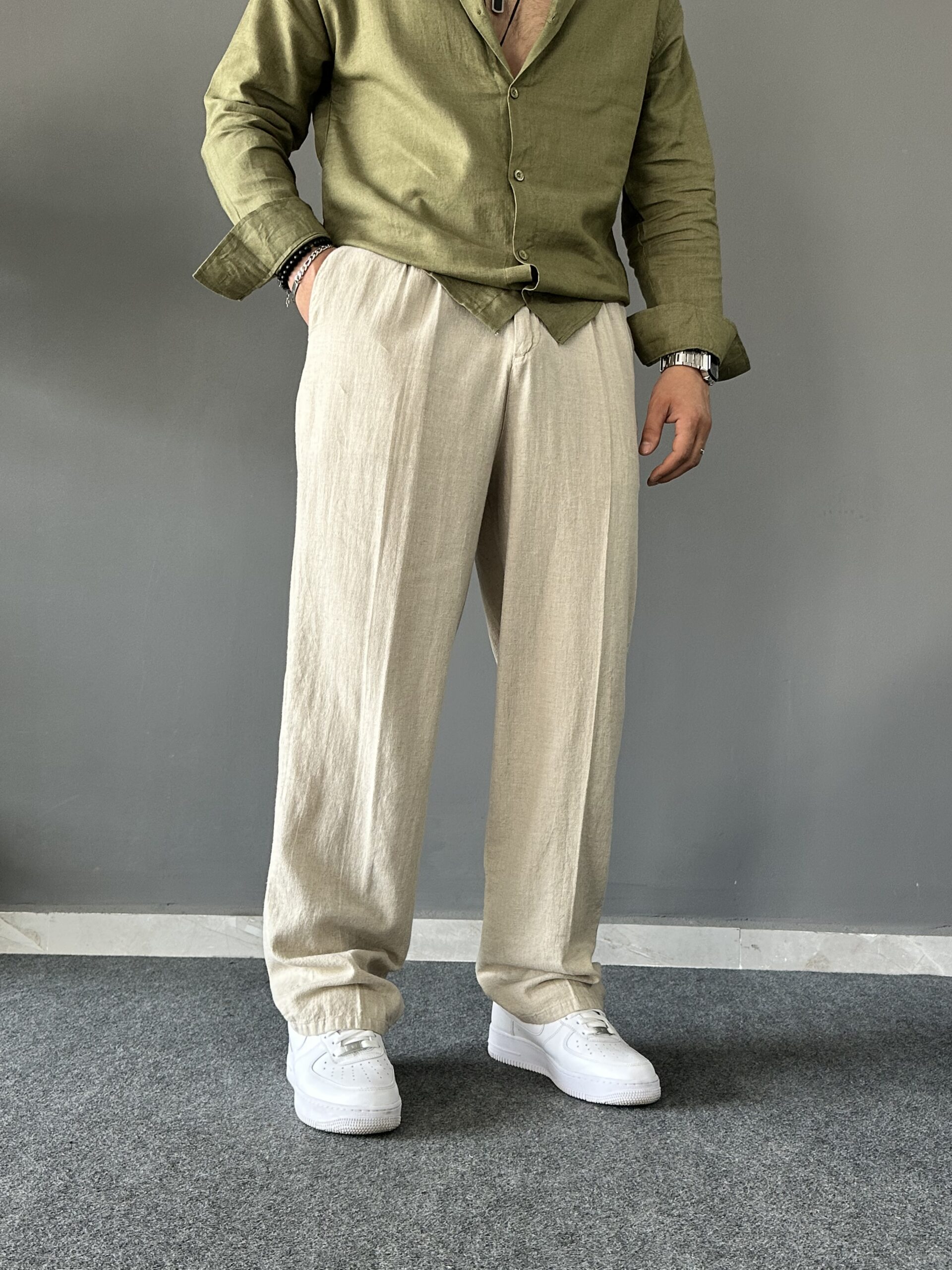 Keten Lastik Bel Pileli Baggy Bej Pantolon