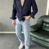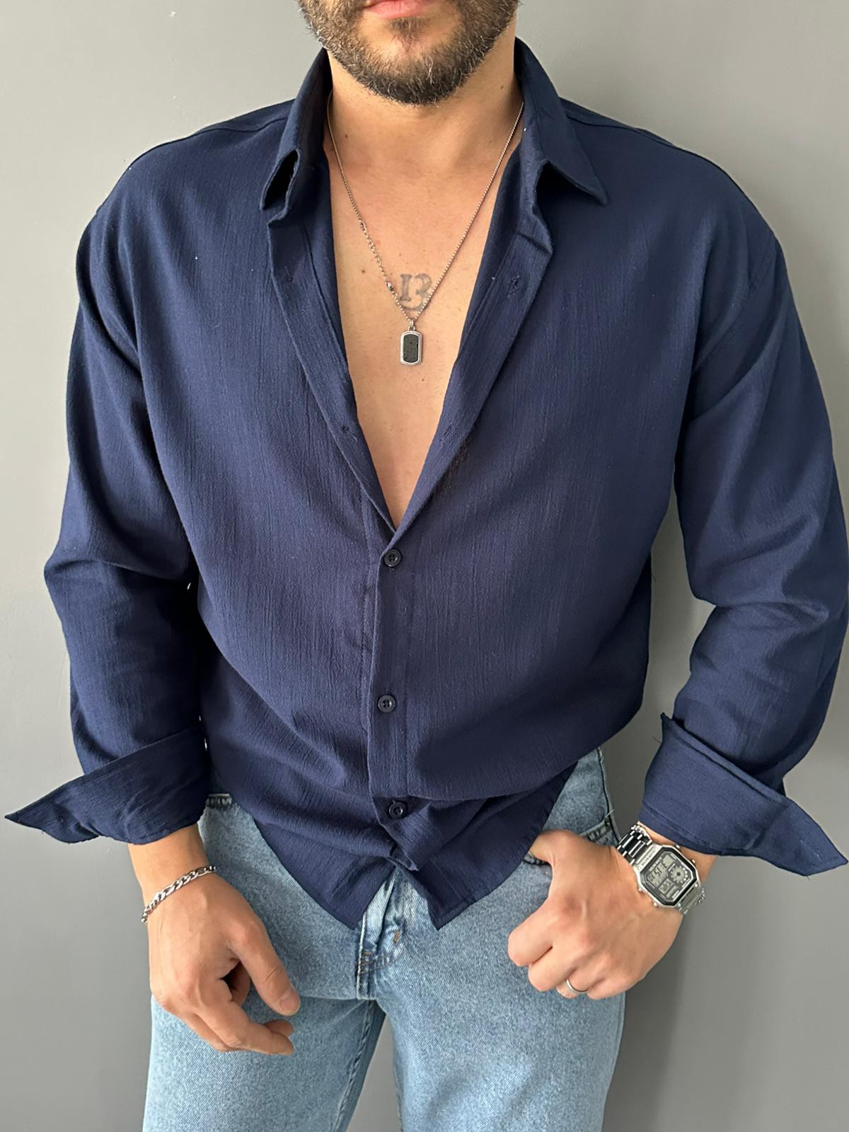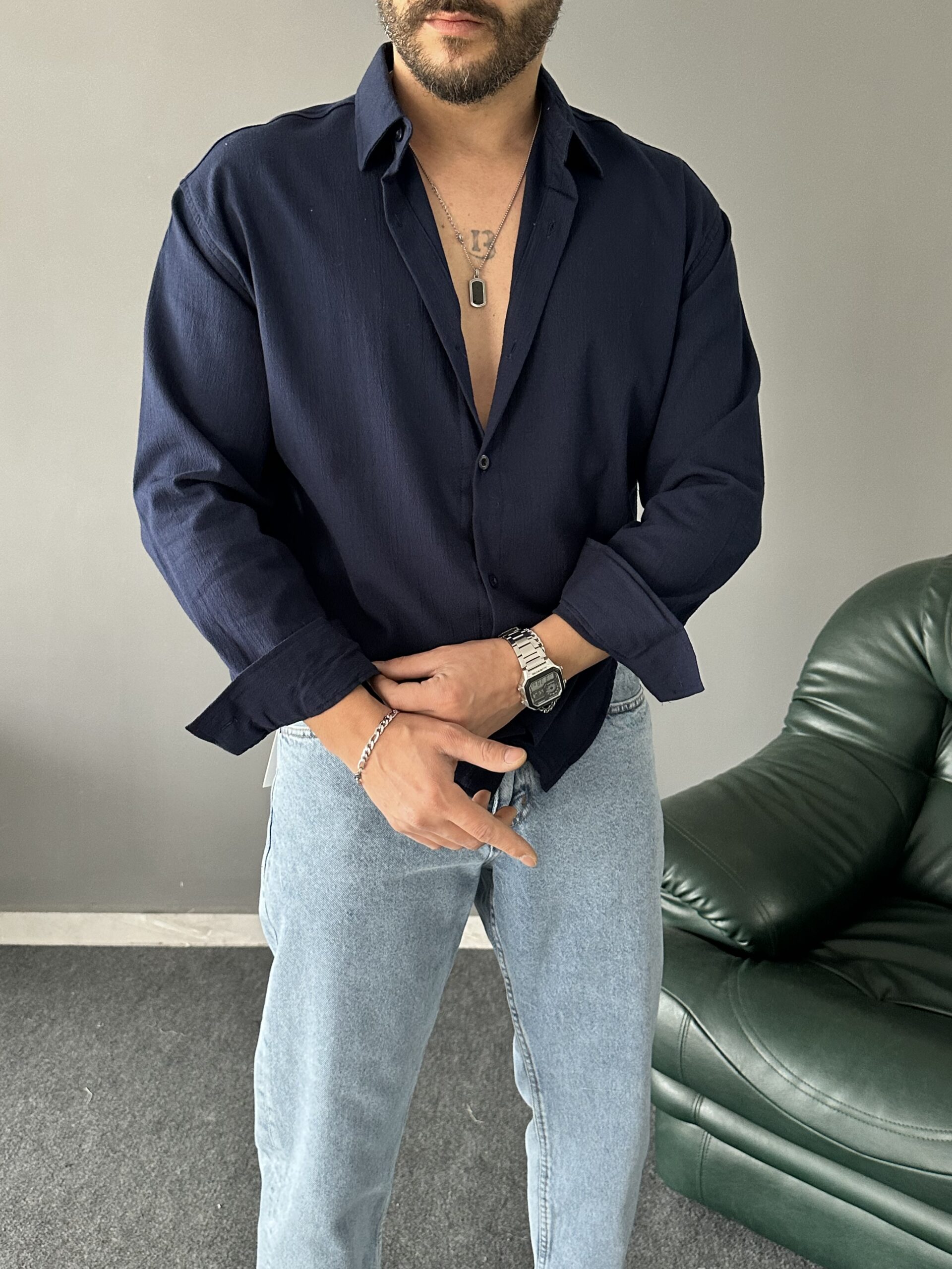 Lacivert Pamuk Krinkıl Oversize Gömlek