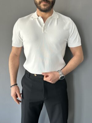 Örme polo yakalı, kapama düğmeli, bilekler ve etek ribanalı, düz kesim, regular kalıp kazak modeldir.