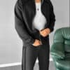 2 parça olarak Üst, Dik yakalı kapaması çelik fermuarlı, 2 adet yan cepli, omuz üzeri dikiş detaylı, oversize kalıplı ceket modeldir.