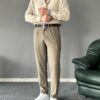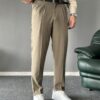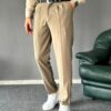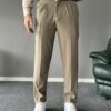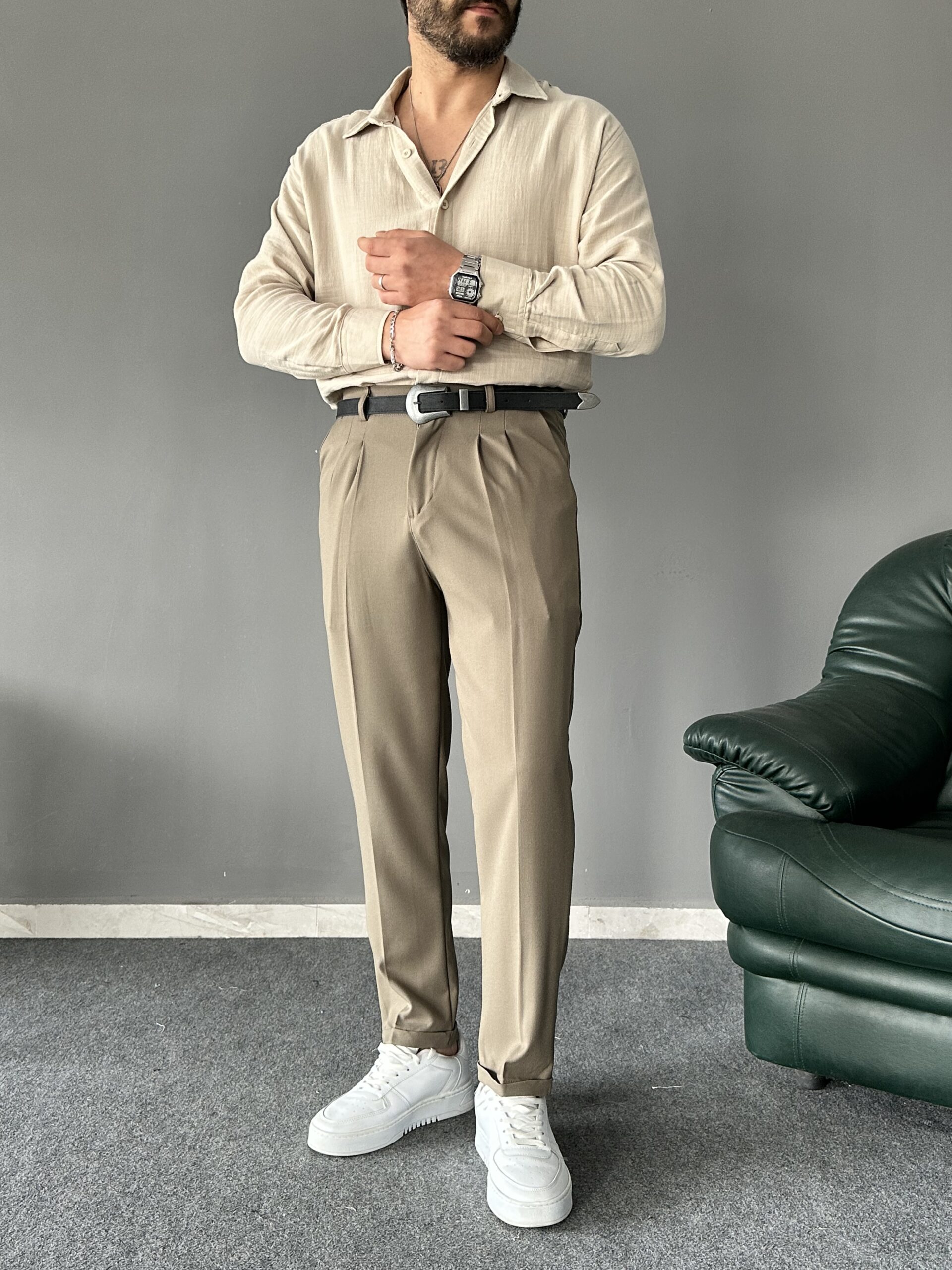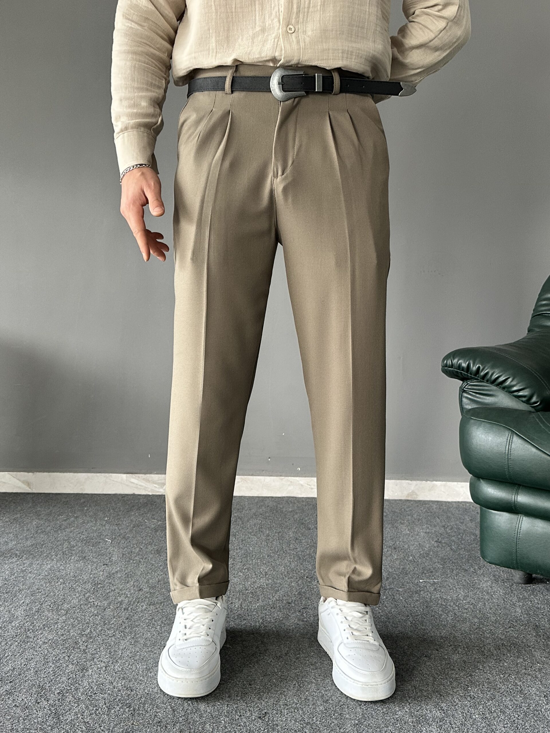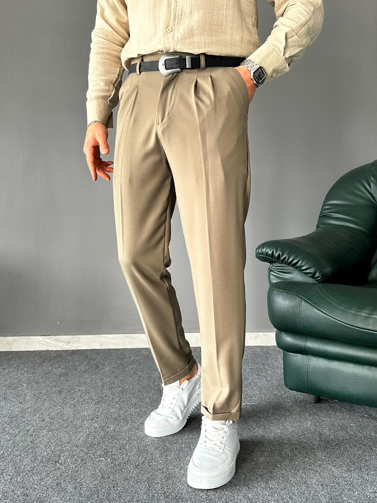Pile Detaylı Kemerli Haki İtalyan Kesim Pantolon